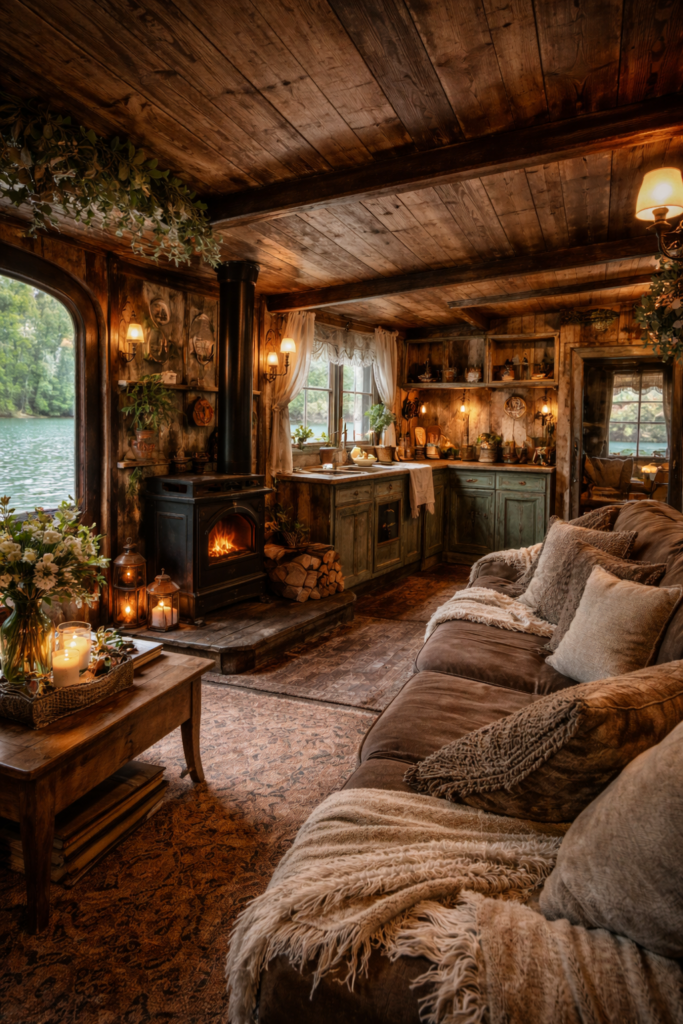 At the heart of the interior, a glowing wood stove adds both warmth and character, making the space perfect for relaxing on cooler days. The open layout flows naturally from a snug living area to a quaint kitchen, where vintage touches and natural textures create a harmonious blend of function and beauty.