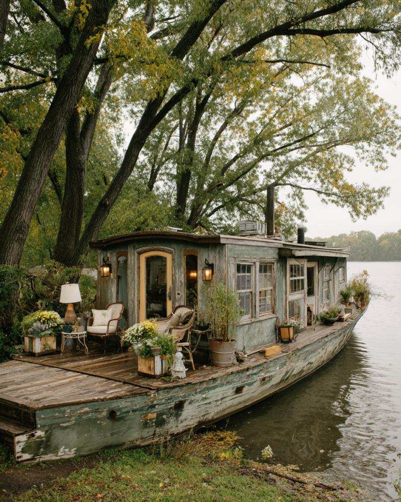 The weathered wood and soft green tones of the boat give it a timeless character, blending perfectly with its natural surroundings. A small wooden deck adorned with plants and simple outdoor furniture creates a welcoming space to enjoy morning coffee or quiet evenings by the water, where every ripple reflects tranquility.