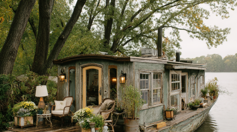 Nestled gently along a quiet, tree-lined riverbank, this charming vintage houseboat captures the essence of slow living and peaceful escape. Surrounded by tall, leafy trees and calm waters, the exterior feels like a hidden retreat where time moves softly, inviting you to pause and breathe in the beauty of nature.