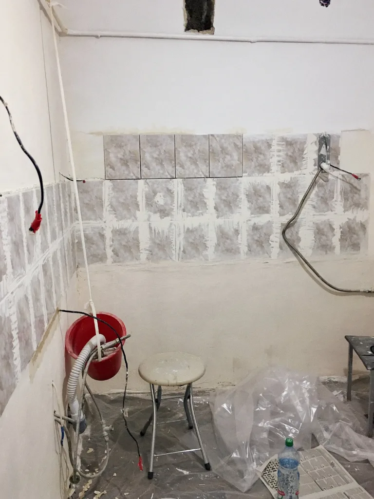 My slightly crazy idea to carefully remove and reuse the tiles from behind the fridge was supported by my very patient father. In the process, we ended up taking off more tiles than we actually needed. While cleaning them in water to remove the leftover adhesive, I accidentally damaged one tile — but thankfully, the rest turned out just fine.
