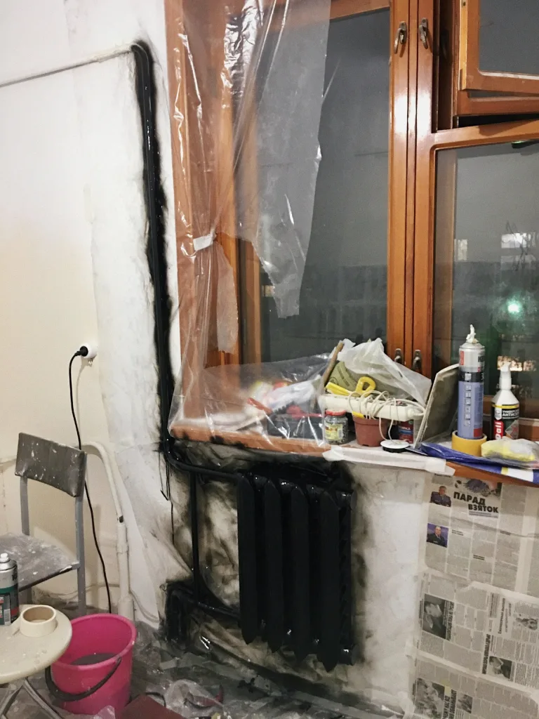 For the renovation, we first used standard Volma plaster to level the walls, then applied a finishing coat to smooth everything out. After that, I simply painted the walls white to brighten the space. I also gave the radiator a fresh new look using KUDO black glossy spray paint. Throughout the makeover, I tried a variety of different materials and brands to see what worked best for the improvements I wanted to make.