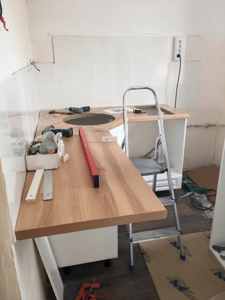 As you can see, the upper cabinets were installed at an awkward angle, so I decided not to include them in the updated design. There was one small problem, though — there weren’t enough tiles to cover the entire top row. Fortunately, that unfinished section was hidden behind the refrigerator, so it remained completely out of sight.