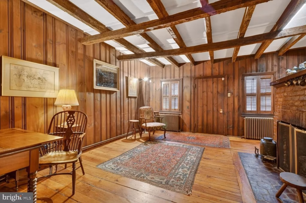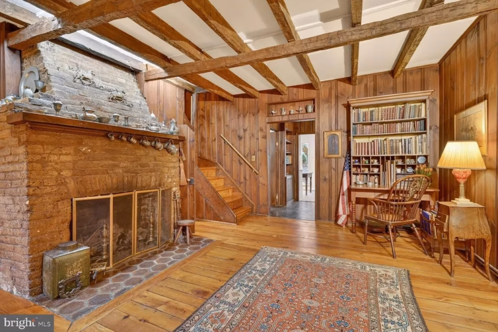 According to the listing, the residence beautifully blends irreplaceable historic character with warmth and charm. Guests are welcomed into a cozy living room filled with timeless details, including dark wood paneling, weathered hand-hewn ceiling beams, and a charming fireplace that adds to the home’s intimate atmosphere.