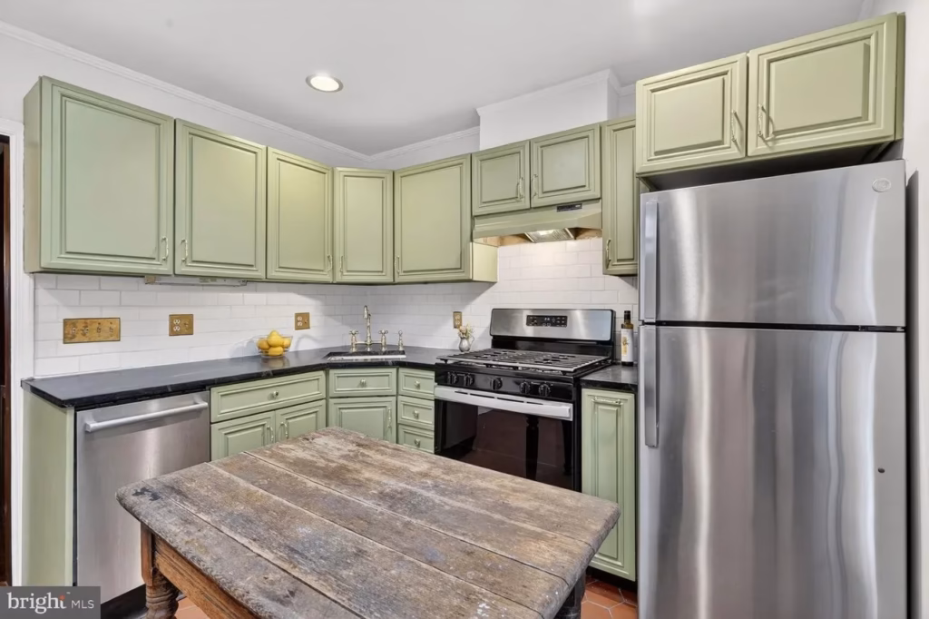 Just beyond the main living space is the chef’s kitchen, which brings a refreshing burst of color with its soft green cabinetry, along with a small island and modern high-end appliances that help balance the home’s old-world charm with everyday functionality.