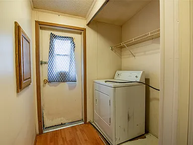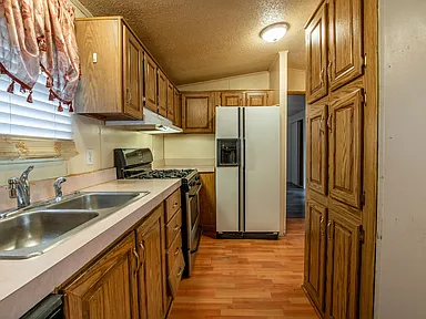 The kitchen and utility area are designed with practicality in mind, offering plenty of cabinet storage, generous counter space, and a functional layout that makes everyday living easy. Warm wood cabinetry gives the space a classic, homey feel, while the nearby laundry area adds extra convenience and efficiency. With solid appliances already in place and room for simple updates, this area provides a great foundation for comfortable daily use and future personalization.