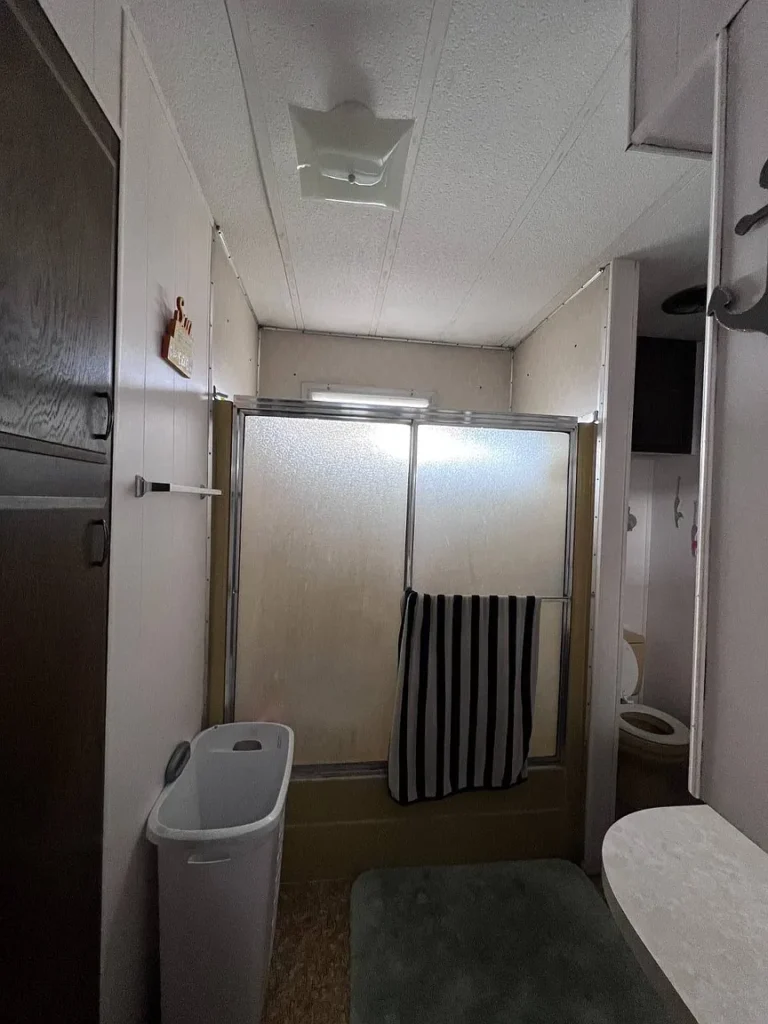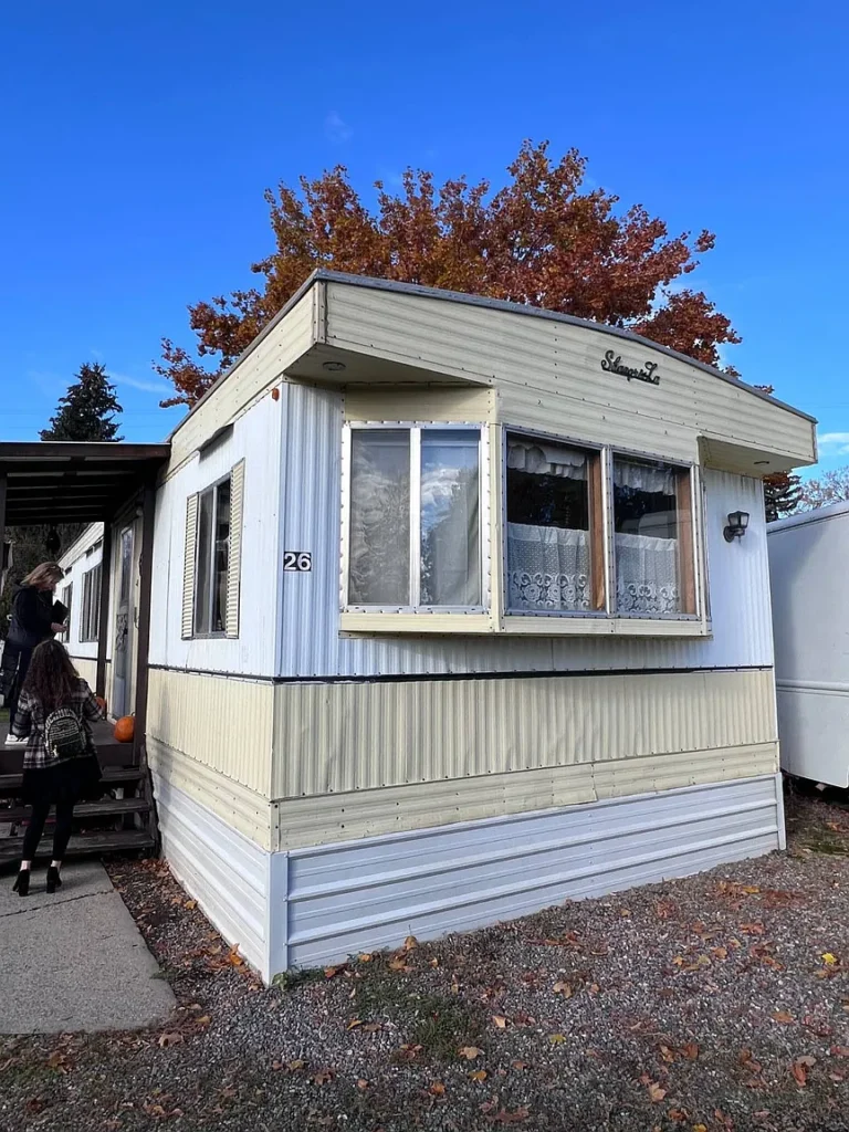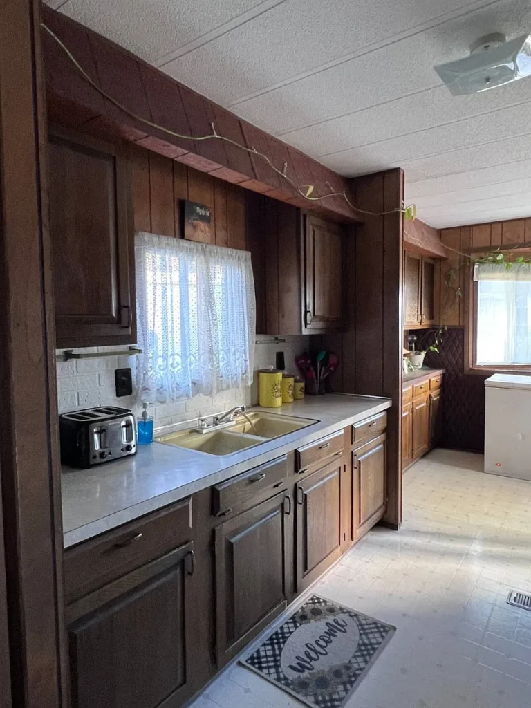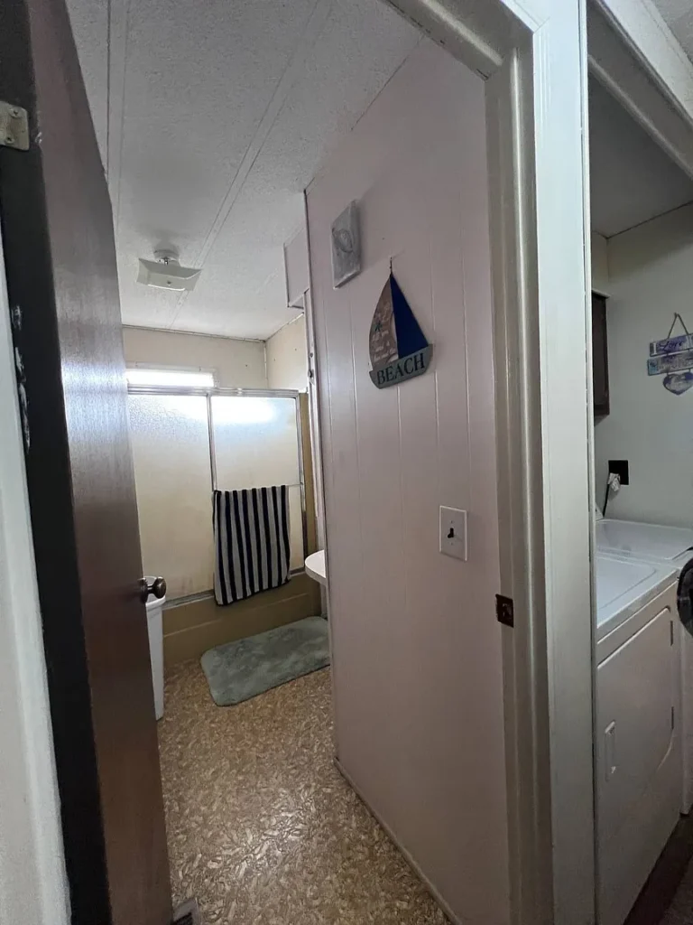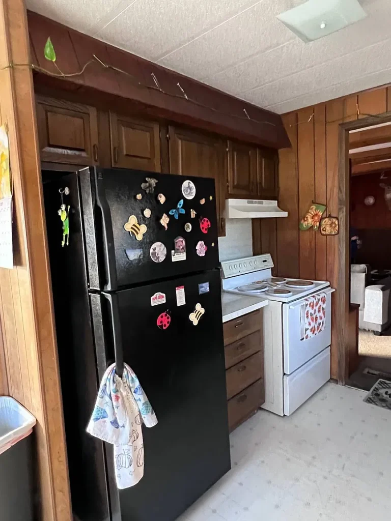Inside, the home features an open kitchen layout with laminate surfaces, along with an included refrigerator and electric stove. The flooring is a mix of linoleum and carpet, providing a functional base that you can easily update and personalize over time.