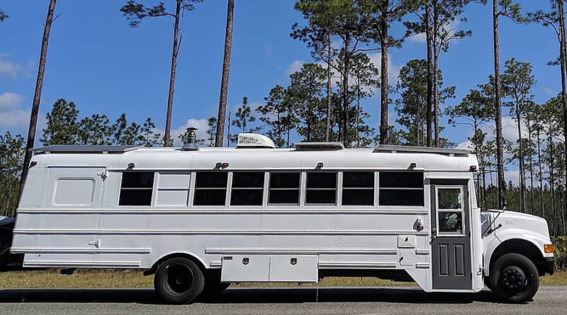 Read MoreExterior ViewThe converted school bus presents a clean, modern exterior with crisp white paint and streamlined details, blending practicality with